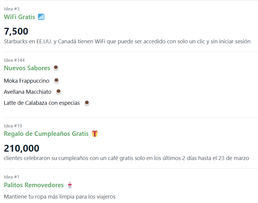 Método de recolección: Starbucks creó «My Starbucks Idea», un foro donde clientes pueden sugerir mejoras y votar ideas de otros.