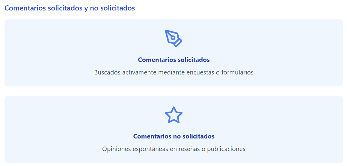 Los comentarios solicitados son aquellos que buscas activamente mediante encuestas, grupos de discusión o formularios específicos. Su principal ventaja es que abordan aspectos particulares de la experiencia que deseas evaluar.