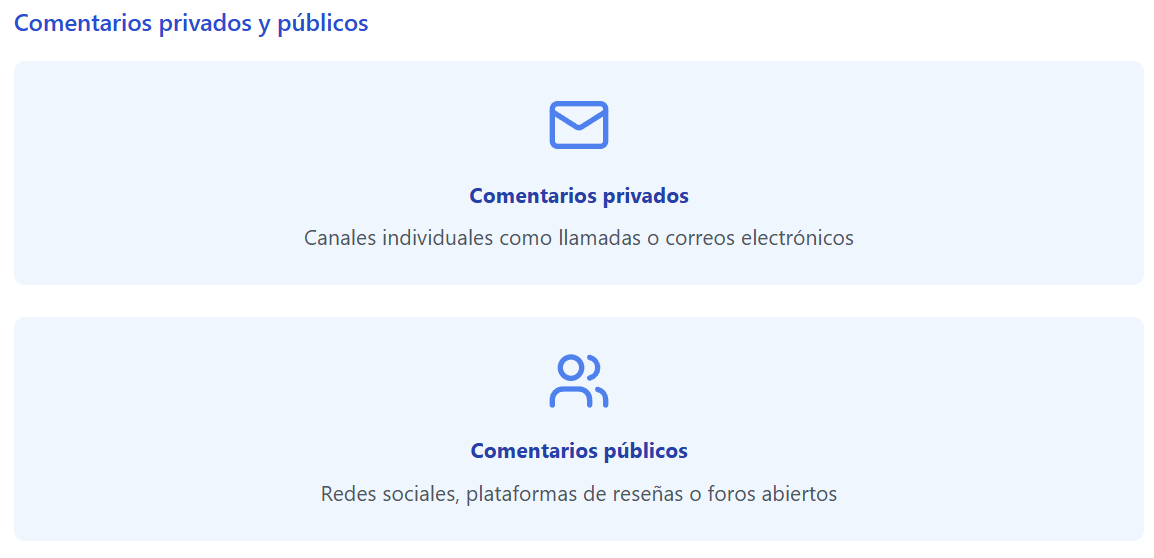 Los comentarios privados llegan por canales individuales como llamadas al servicio, correos electrónicos o encuestas privadas. Estos aportan información detallada y permiten cerrar el bucle de retroalimentación internamente con acciones concretas.