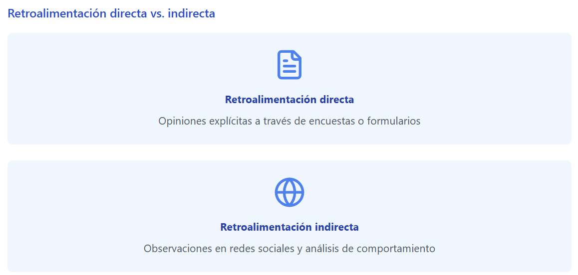 La retroalimentación directa ocurre cuando los clientes comparten explícitamente sus opiniones a través de encuestas, entrevistas o formularios. Este tipo proporciona información clara y práctica sobre aspectos específicos de tu producto o servicio.