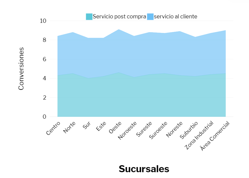 Imaginemos una evaluación de la calidad del servicio en varias sucursales de una empresa, las calificaciones de la «Encuesta post compra» y «Servicio al cliente» proveen una visión clara de cómo los clientes perciben su experiencia en diferentes ubicaciones.