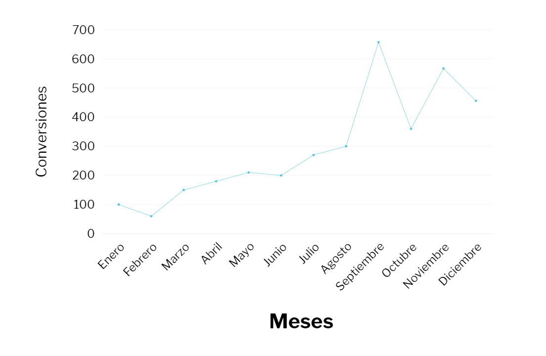 Supongamos que estás revisando la eficacia de tus esfuerzos de marketing a lo largo del tiempo. Un gráfico de líneas puede llevarte en un viaje visual a través de los cambios en los indicadores clave, como las conversiones o el tráfico del sitio web. Es como tener una hoja de ruta visual para guiar tus decisiones de marketing.