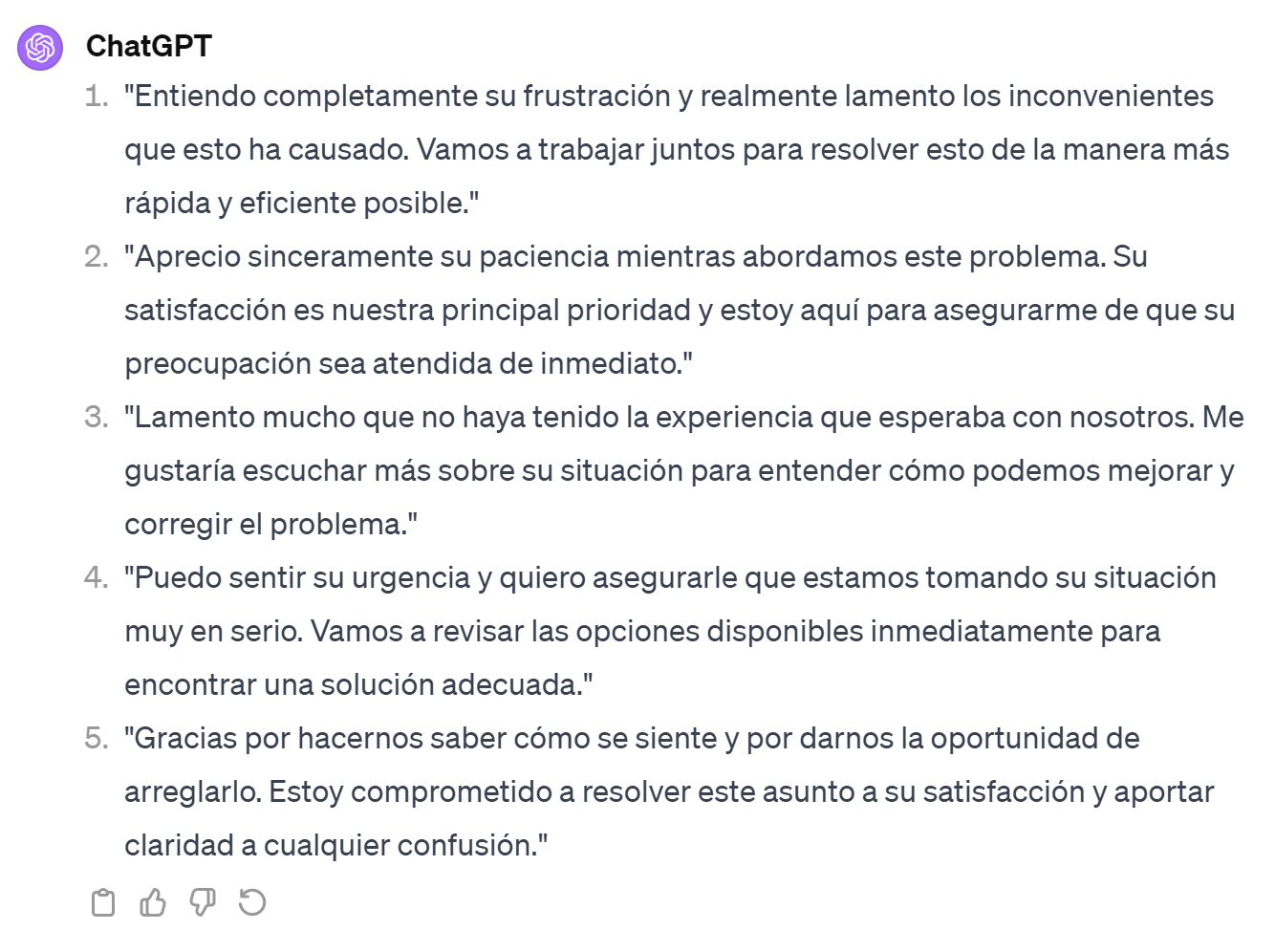 Estos prompts permiten evaluar tus respuestas de servicio al cliente usando ChatGPT ante problemas comunes y tu capacidad de brindar satisfacción.
