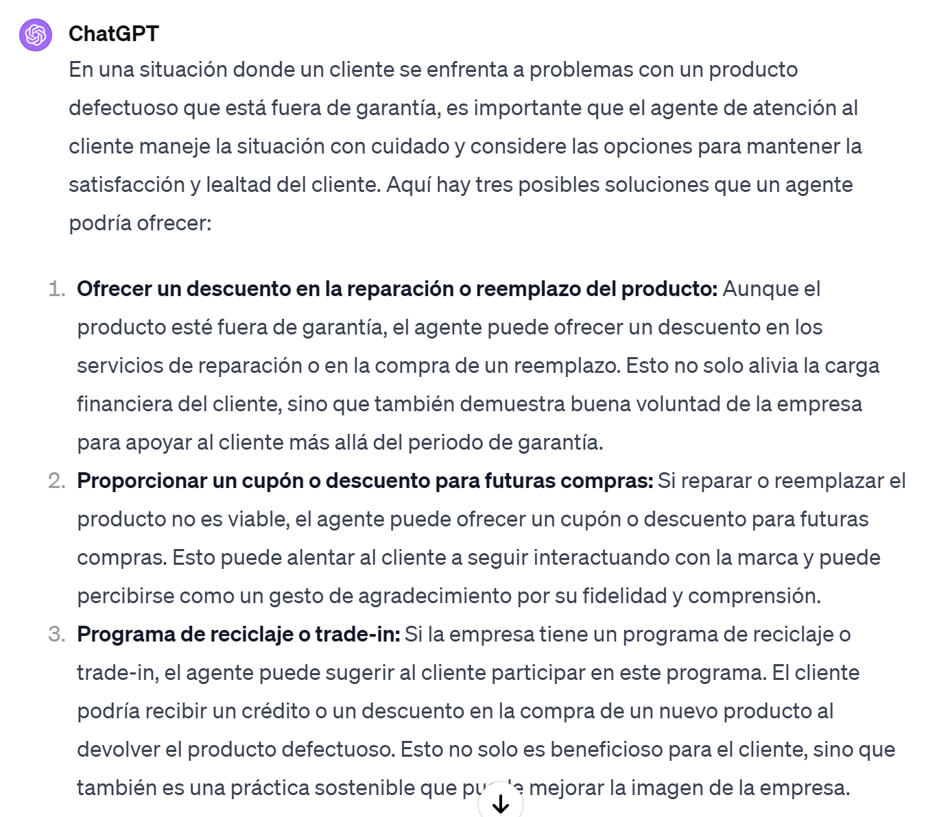 Un cliente se queja de un producto defectuoso fuera de garantía. Por favor, sugiere 3 posibles soluciones que un agente podría ofrecer en esta situación