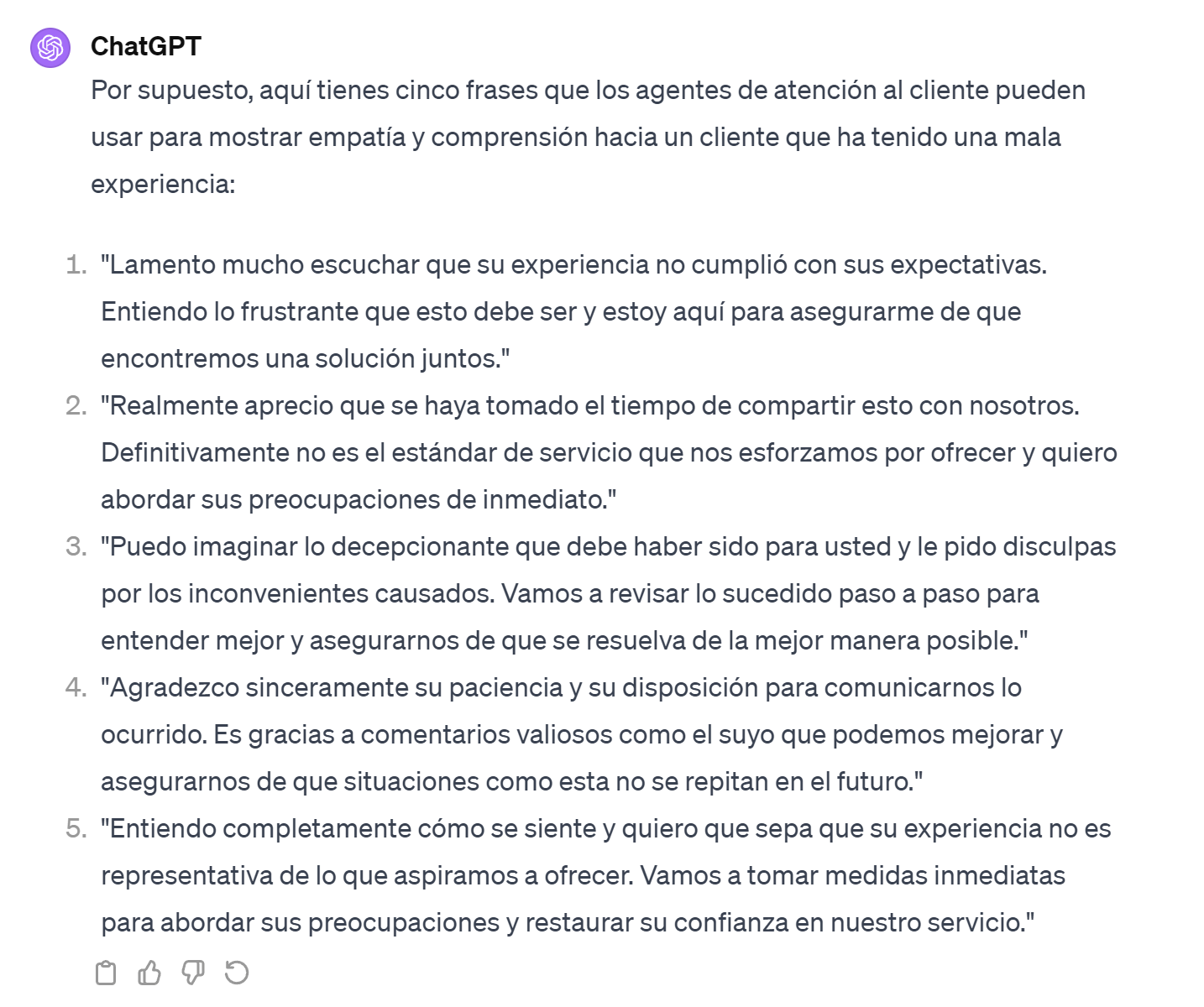 A continuación te mostraré algunos prompts efectivos que puedes utilizar desde ya con ChatGPT para elevar la calidad de atención a clientes en tu negocio: