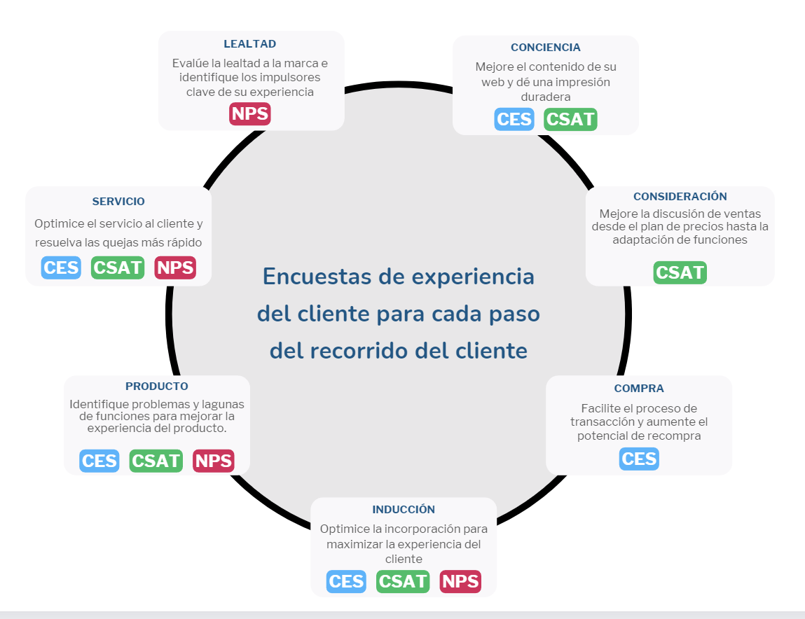 Existen tres principales de encuestas sobre la experiencia del cliente que consisten en una única pregunta con un seguimiento abierto: Satisfacción del Cliente (CSAT), Puntuación de Esfuerzo del Cliente (CES) y Puntuación de Promotor Neto (NPS). Además de estas, también se pueden emplear escalas de calificación alternativas en encuestas de 5 estrellas, encuestas de caras sonrientes o encuestas de pulgar arriba/abajo.