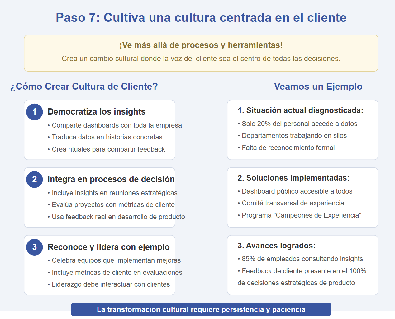 El último paso trasciende las herramientas y procesos para crear un cambio cultural duradero donde la voz del cliente sea el centro de todas las decisiones de tu organización.