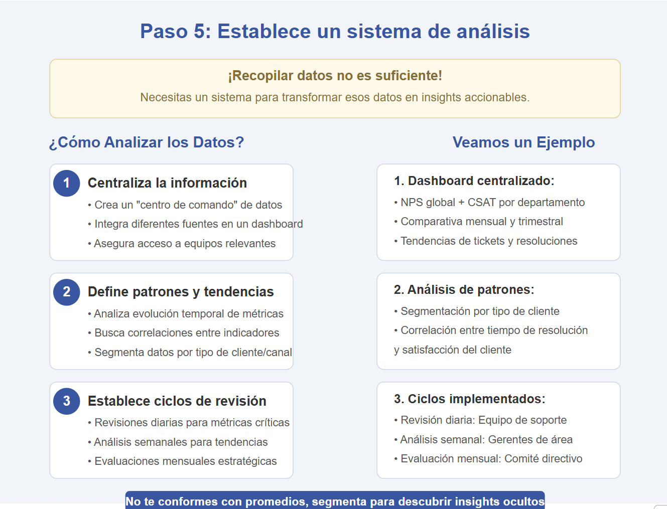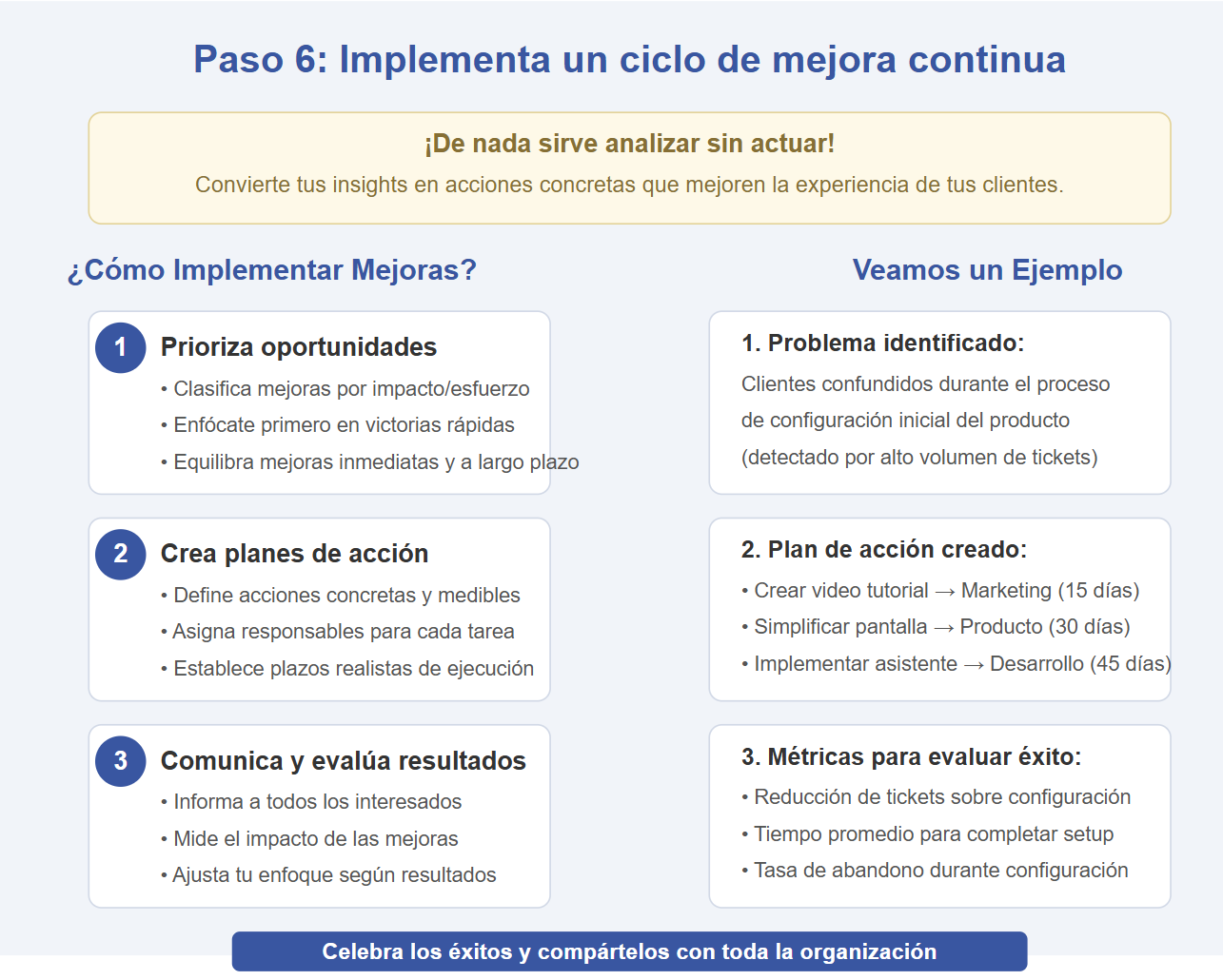 Recopilar y analizar datos solo tiene valor si conduces acciones concretas que mejoren la experiencia de tus clientes. Este paso es donde muchas empresas fallan, quedándose en la etapa de diagnóstico sin pasar a la acción.