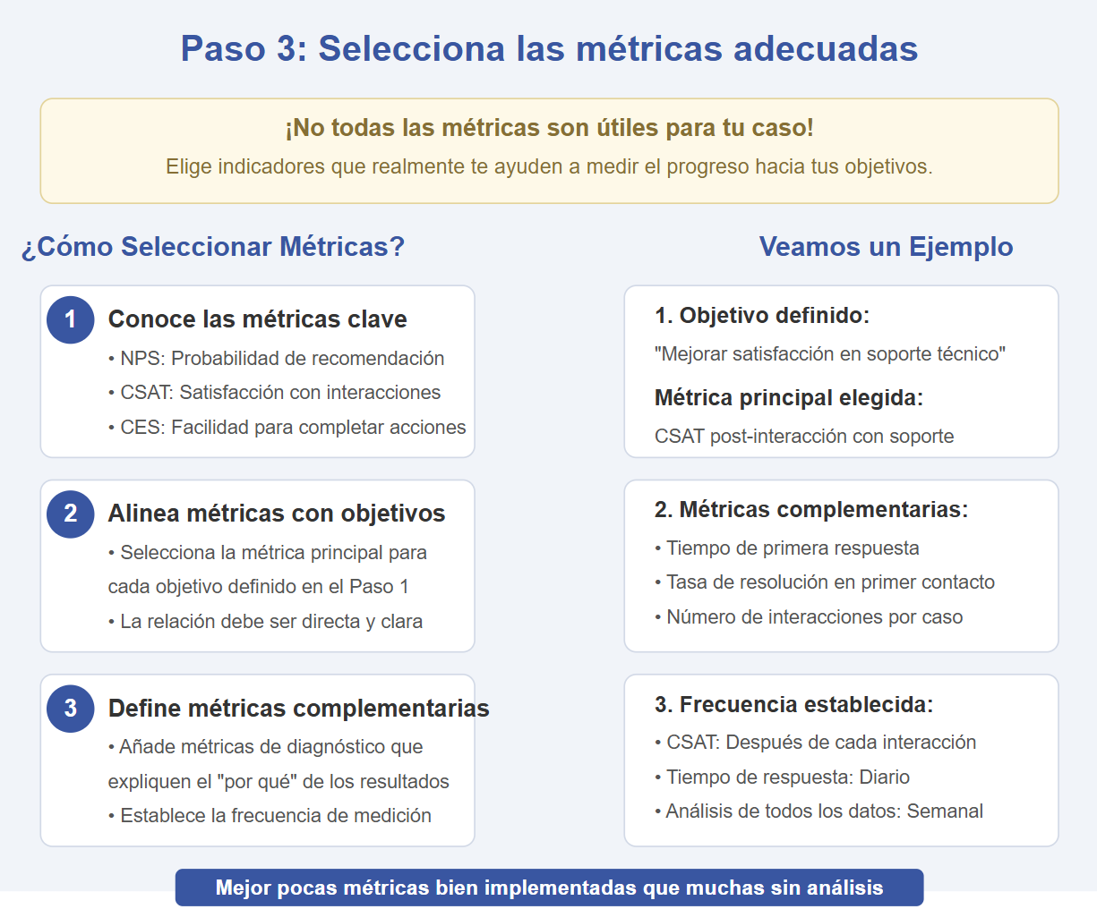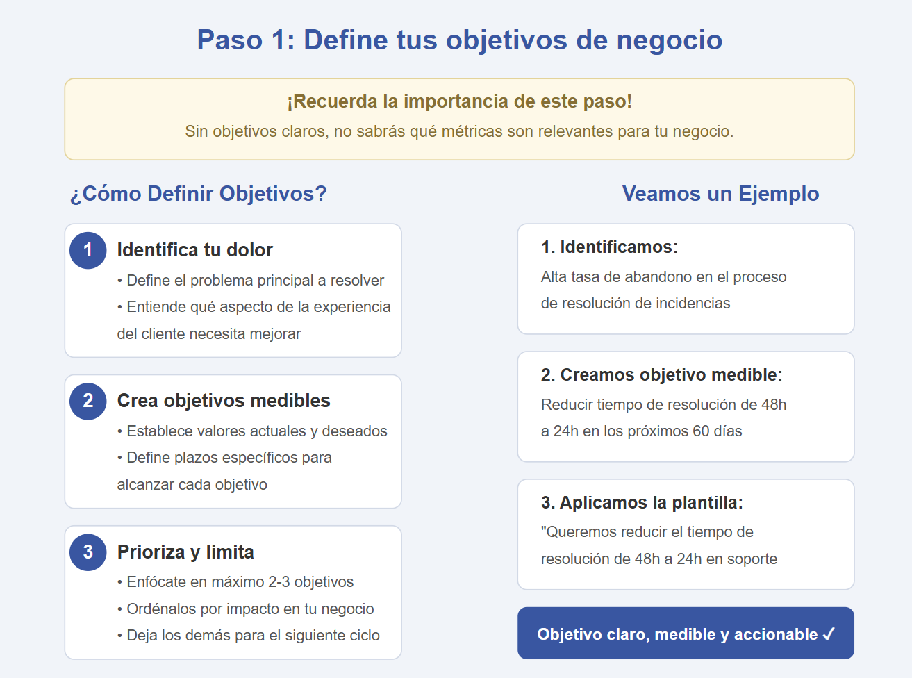 Consejo clave: Asegúrate de que tus objetivos estén alineados con tu propuesta de valor. Si prometes atención personalizada, tus métricas deberían enfocarse en la calidad de las interacciones, no solo en la velocidad.
