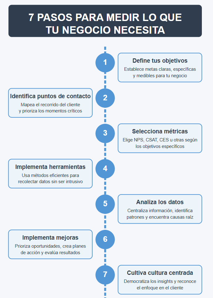 A continuación, descubre los 7 pasos esenciales para determinar qué debes medir en tu estrategia de feedback y experiencia del cliente para obtener insights que realmente transformen tu negocio.