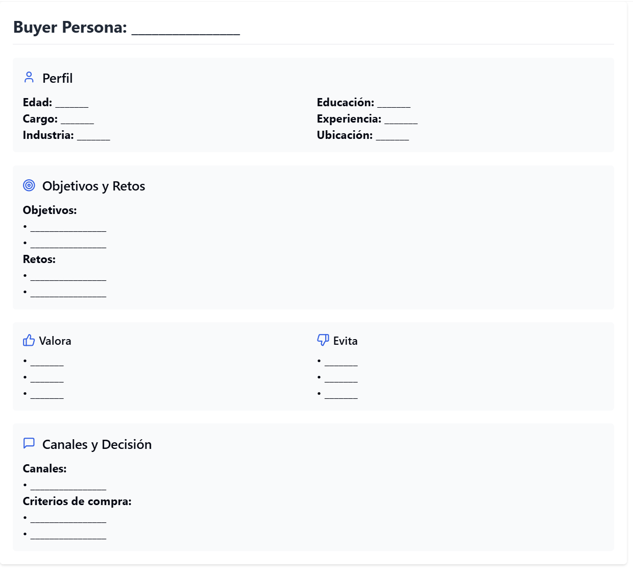 El primer paso para revertir esta situación es crear un perfil detallado de cliente que vaya más allá de los datos demográficos básicos. Este perfil debe incluir información sobre sus objetivos de negocio, desafíos diarios, métricas de éxito y el contexto en el que utilizan tus servicios o productos.