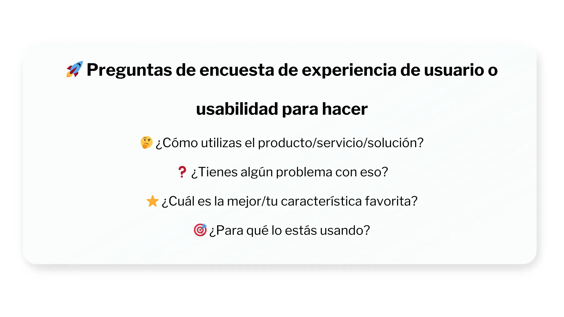 Las encuestas de UX te indicarán lo sencillo que es para tus clientes utilizar tu producto, servicio y otras soluciones y funciones que ofreces. Puedes hacer todo tipo de preguntas con este tipo de encuesta. Algunas ideas son: