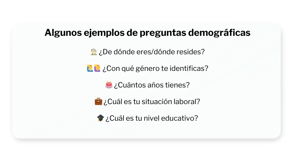 Los datos demográficos juegan un papel importante en tus estrategias de marketing y ventas y te dirán quiénes son tus compradores. Si los objetivos de tu encuesta incluyen recopilar información para realizar un análisis estadístico de tu público objetivo y conocerlo mejor, necesitas preguntas demográficas.
