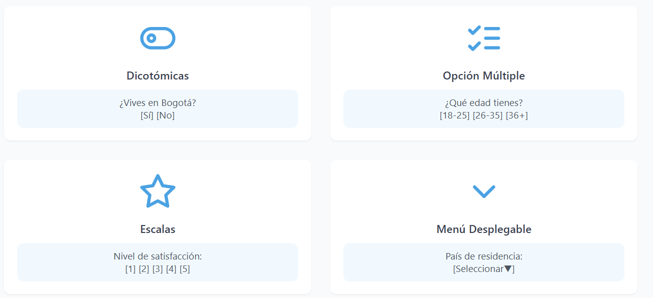 Los tipos de preguntas más comunes que encontraremos en las encuestas se pueden clasificar en las siguientes categorías: