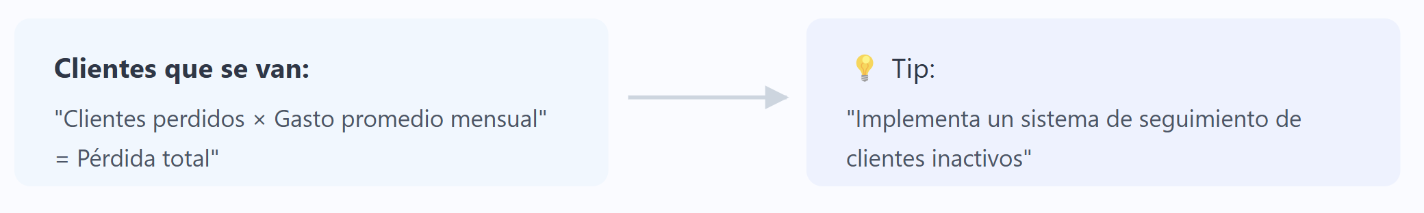 Ejemplo: “María tiene una tienda de productos naturales. El mes pasado, 15 clientes habituales dejaron de comprar. Al llamarlos, 10 mencionaron que los nuevos vendedores no sabían asesorar sobre los productos. Cada cliente gastaba un promedio de $45,000 mensuales. Resultado: está perdiendo $450,000 al mes por falta de capacitación.”