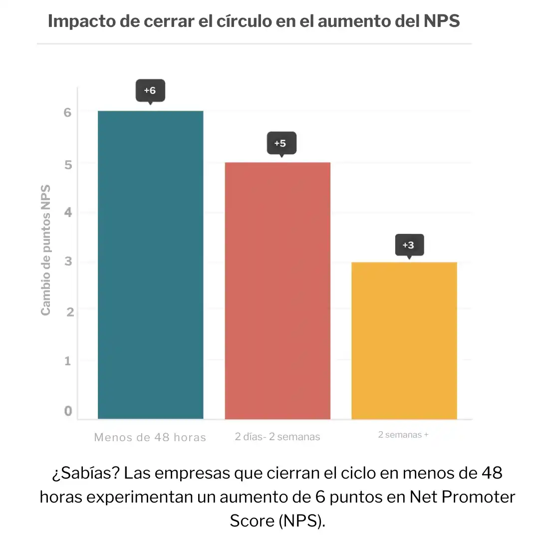 ¿Sabías? Las empresas que cierran el ciclo en menos de 48 horas experimentan un aumento de 6 puntos en Net Promoter Score (NPS).