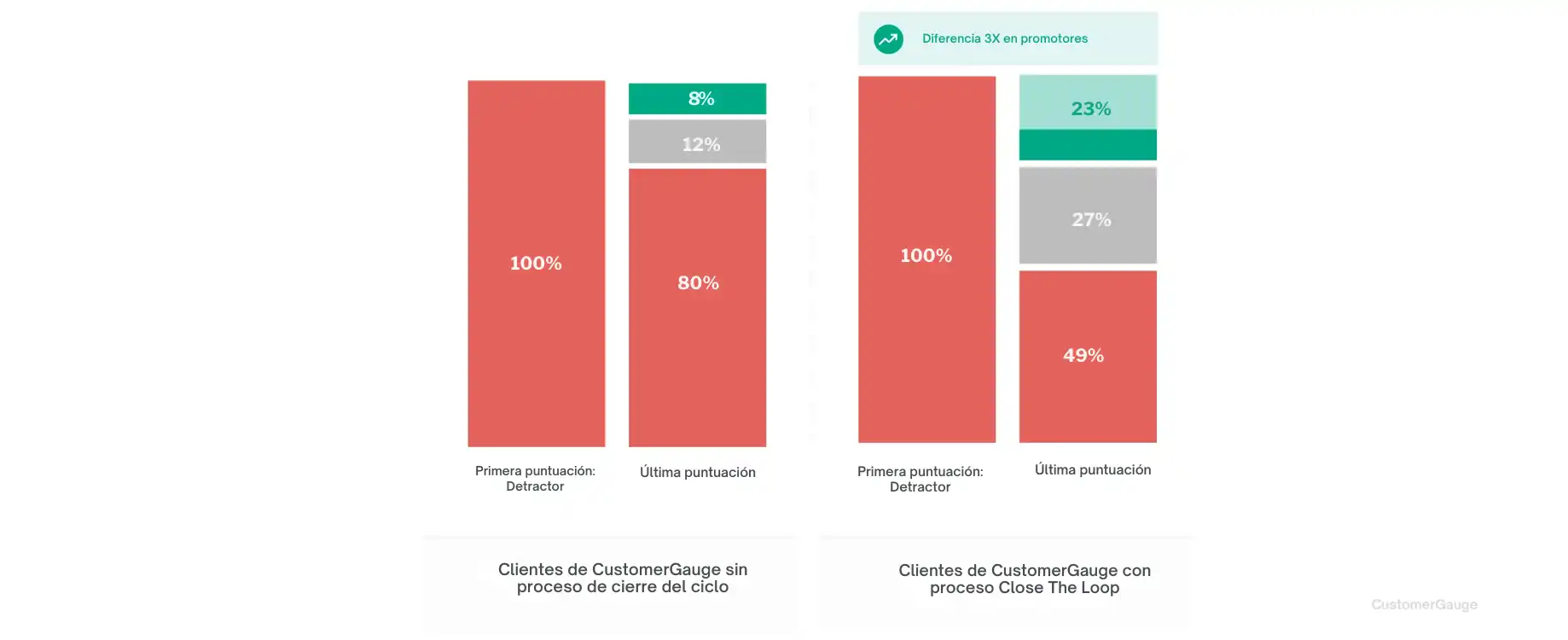 Una investigación de CustomerGauge en 2022 descubrió que las empresas que cerraron el circuito después de realizar una encuesta NPS tenían 3 veces más promotores la próxima vez que realizaron la encuesta (en comparación con aquellas que no tenían un proceso de circuito cerrado)