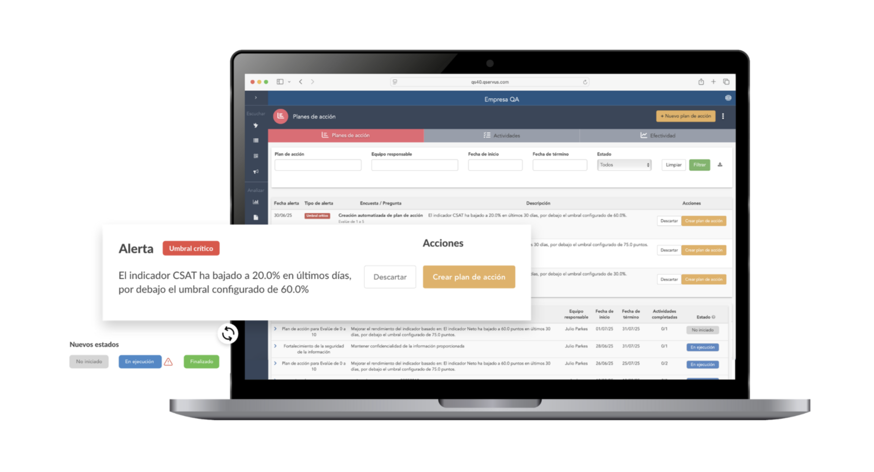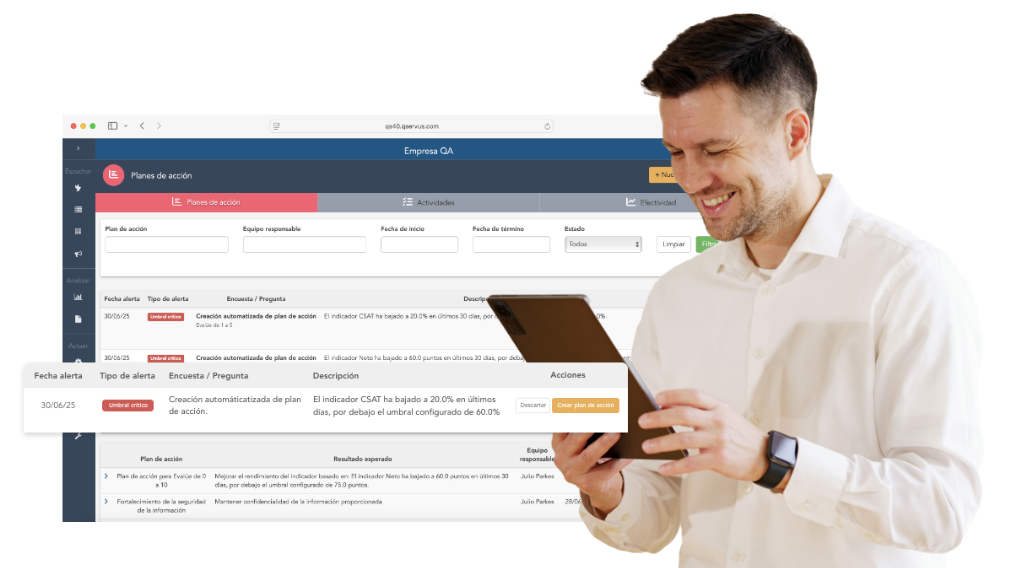 QServus se destaca en esto también: su plataforma no solo detecta las falencias, sino que activa procesos automáticos para responder al feedback. Desde la generación de tickets hasta alertas inmediatas, cada acción está diseñada para garantizar que no hayas pasado por alto ningún comentario que pueda afectar la experiencia del cliente.