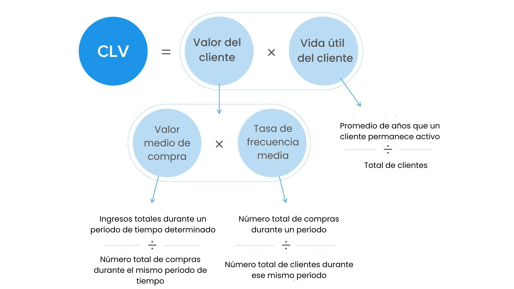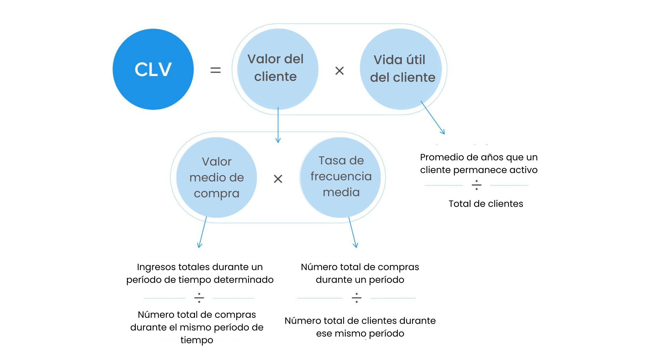 CLV = (Valor promedio de compra por cliente x Frecuencia de compra por cliente x Duración de la relación con el cliente)