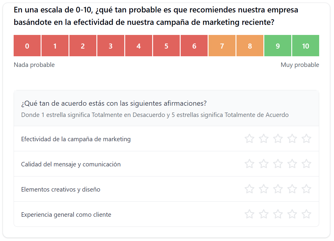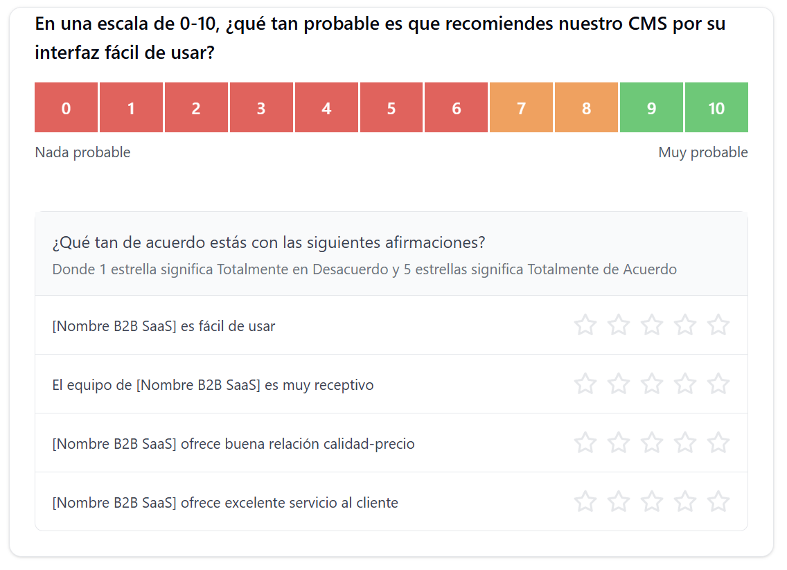 En B2B SaaS, hay múltiples puntos de contacto en los que puedes enviar encuestas NPS, pero enviar las encuestas no es suficiente. Debes hacer las preguntas correctas para obtener insights ocultos que te ayudarán a mejorar la satisfacción del cliente.