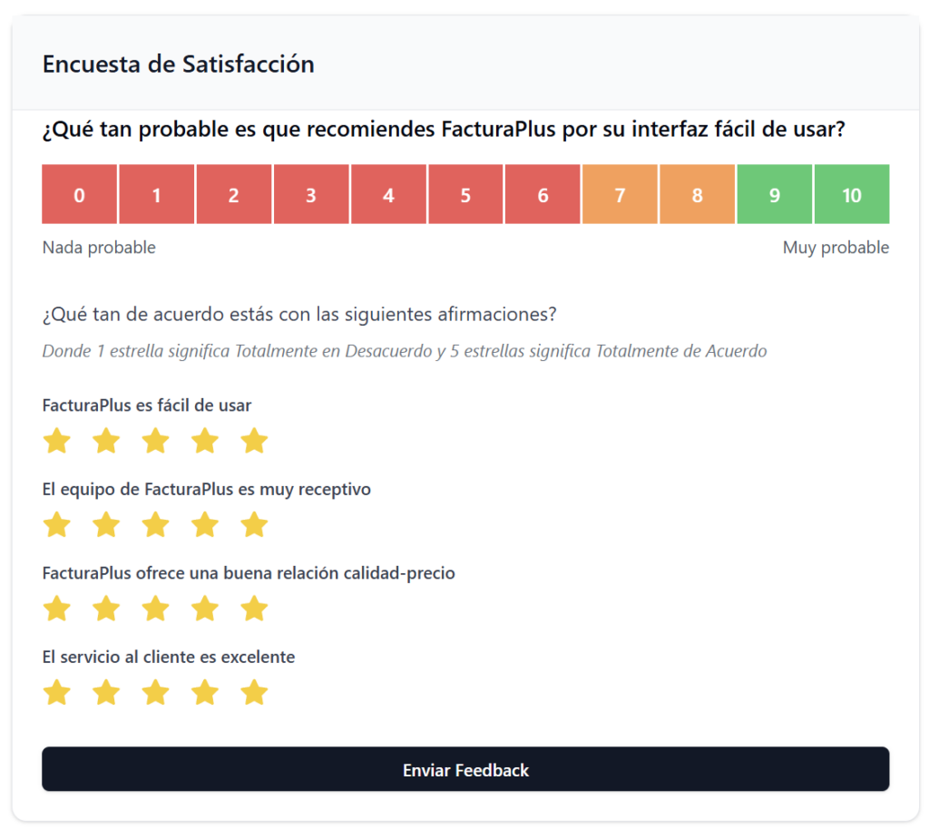 1. Pregunta NPS principal: «En una escala del 0 al 10, ¿qué tan probable es que recomiendes FacturaPlus a otros negocios?»