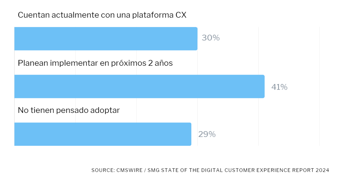 De acuerdo al mismo estudio, sólo el 30% de las compañías cuenta actualmente con una plataforma de experiencia del cliente. Si bien otro 41% planea implementarla en los próximos 2 años, un significativo 29% no tiene pensado adoptar este tipo de soluciones. Esto demuestra un enorme potencial para optimizar las capacidades CX en las organizaciones a través de tecnologías especializadas.