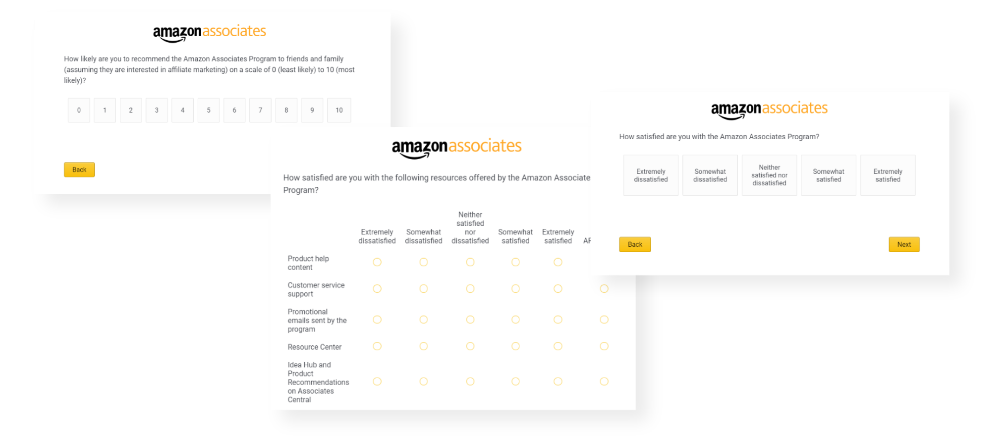 Esta encuesta es solo una muestra del enfoque detallado de Amazon. La encuesta completa incluye muchas más páginas para recopilar toda la información necesaria para mejorar continuamente su Programa de Afiliados.