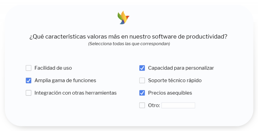 Por ejemplo, este tipo de pregunta puede usarse para conocer el rol laboral del usuario para la segmentación de clientes y ofrecer múltiples opciones para seleccionar.