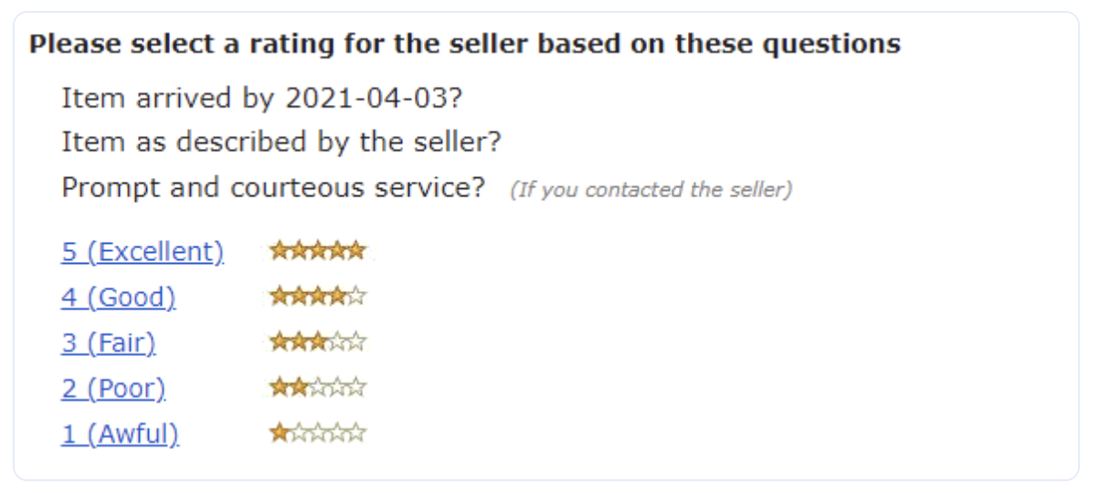 Por ejemplo, Amazon envía preguntas de calificación para entender mejor el desempeño de sus vendedores, permitiendo a los clientes evaluar aspectos como: