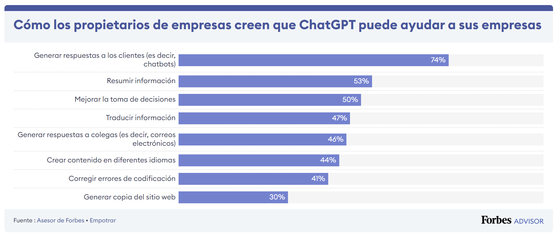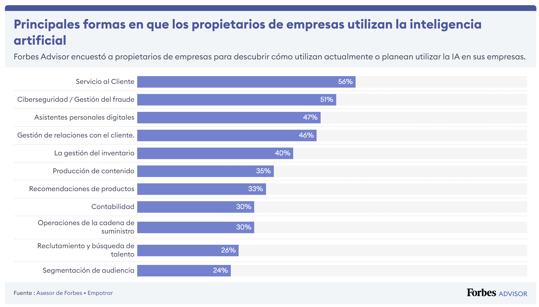 Las empresas están recurriendo cada vez más a la IA para mejorar y perfeccionar sus operaciones. Según la encuesta de Forbes Advisor, las empresas están utilizando la IA en una amplia gama de áreas. Las aplicaciones más populares incluyen el servicio al cliente, donde el 56% de los encuestados utiliza IA para este propósito, y la ciberseguridad y la gestión del fraude, adoptadas por el 51% de las empresas.