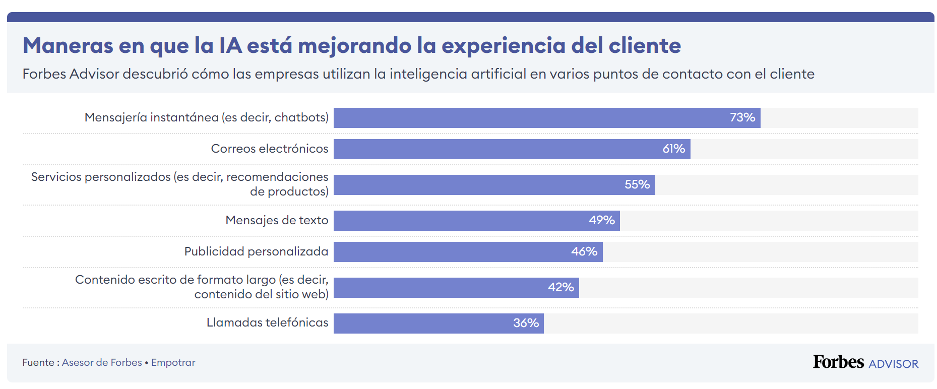 La IA está desempeñando un papel clave en la mejora de las experiencias de tus consumidores en todos los puntos de contacto. Según la encuesta de Forbes Advisor, el 73% de las empresas utilizan o planean utilizar chatbots con tecnología de inteligencia artificial para mensajería instantánea. Además, el 61% utiliza la IA para optimizar los correos electrónicos, mientras que el 55% la implementa para servicios personalizados, como recomendaciones de productos.
