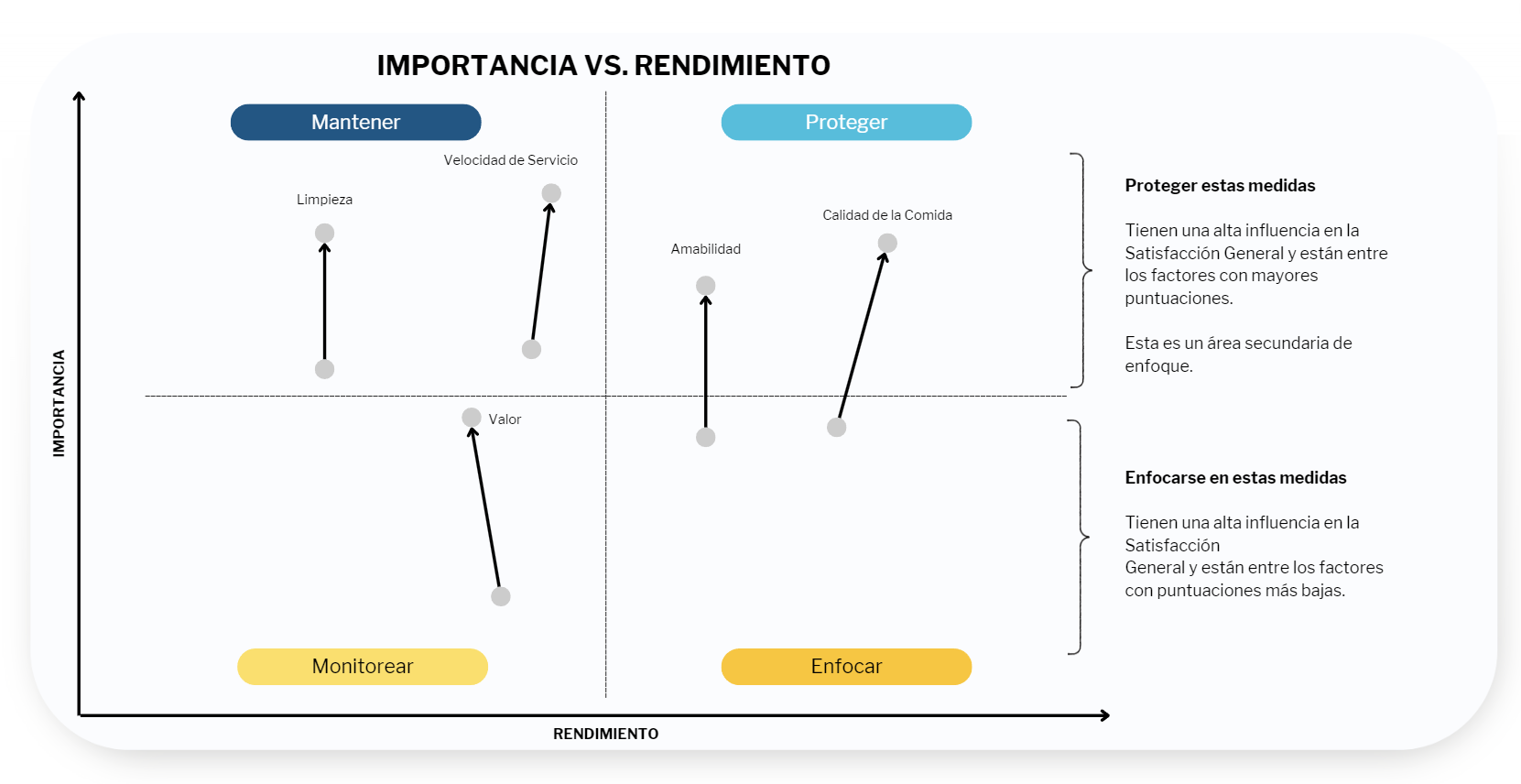 La importancia derivada tiene la ventaja de no necesitar preguntas adicionales. Utiliza las evaluaciones existentes de los MTM y la experiencia global para deducir cuáles impactan más esa percepción general.