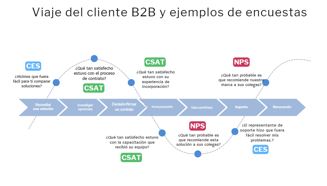 Considere utilizar encuestas como el Net Promoter Score (NPS), el Customer Satisfaction Score (CSAT) o el Customer Effort Score (CES) para obtener opiniones directas de los clientes e incluirlas en su mapa de recorrido del cliente. Luego, elija entre diversos canales de encuesta (correo electrónico, web, enlace o Kit de desarrollo de software (SDK)) para llegar a su audiencia donde sea que se encuentre.
