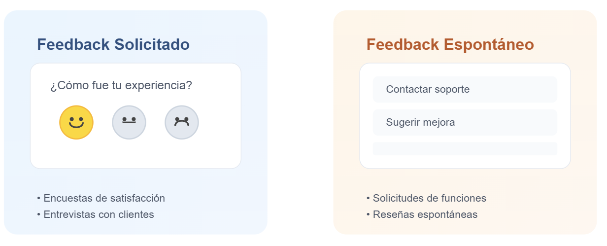 Existen muchos tipos de comentarios de clientes que pueden ayudarte a mejorar. Algunos son evidentes, como las solicitudes de nuevas funciones. Otros son más sutiles, como las preguntas sobre tu producto. En ocasiones, buscas activamente estos comentarios, mientras que otras veces los clientes los comparten por iniciativa propia.
