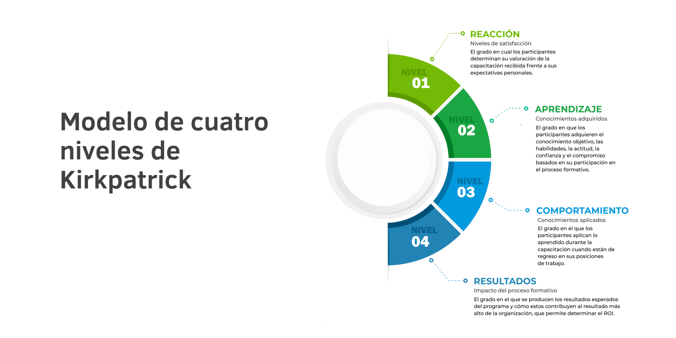 Este proceso de evaluación de la formación es utilizado en todo el mundo por las empresas que pretenden obtener un retorno de la inversión (ROI) a través de sesiones de formación rentables y eficaces en el tiempo. Este modelo desglosa el proceso de evaluación en 4 niveles: