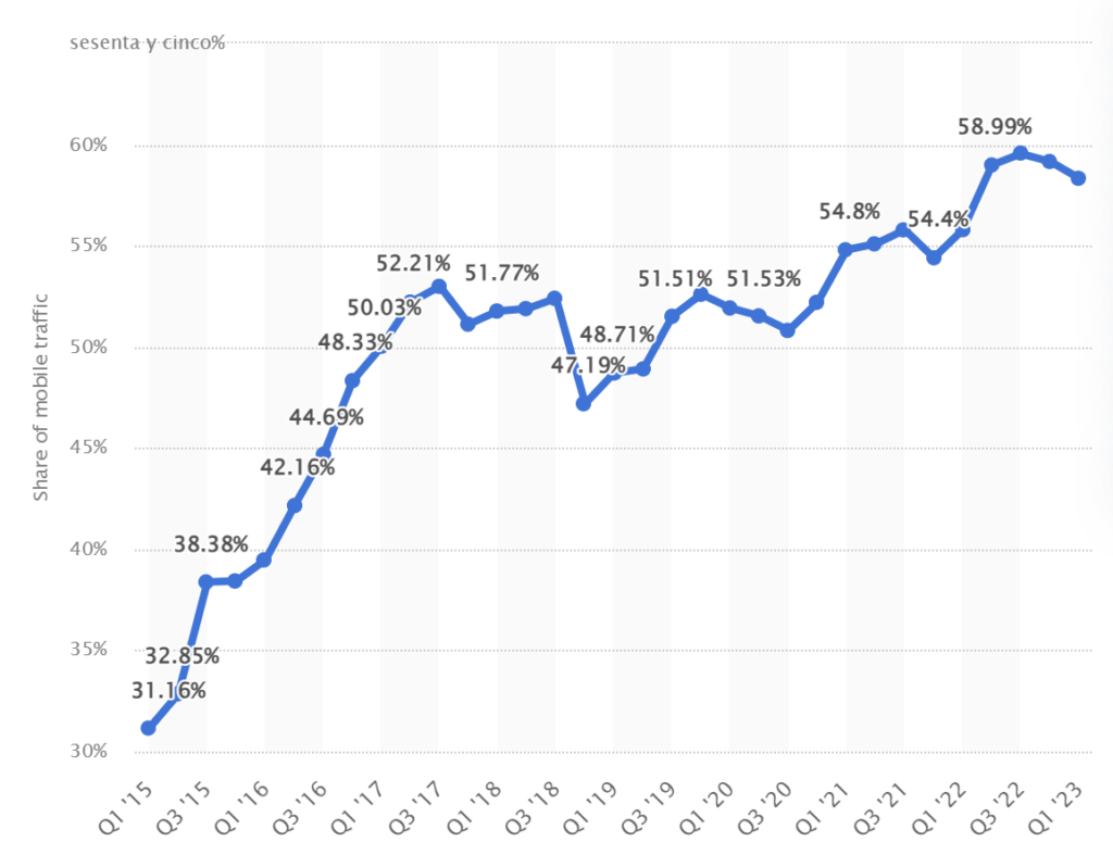 - El 58.33% del tráfico de sitios web en todo el mundo proviene de dispositivos móviles.