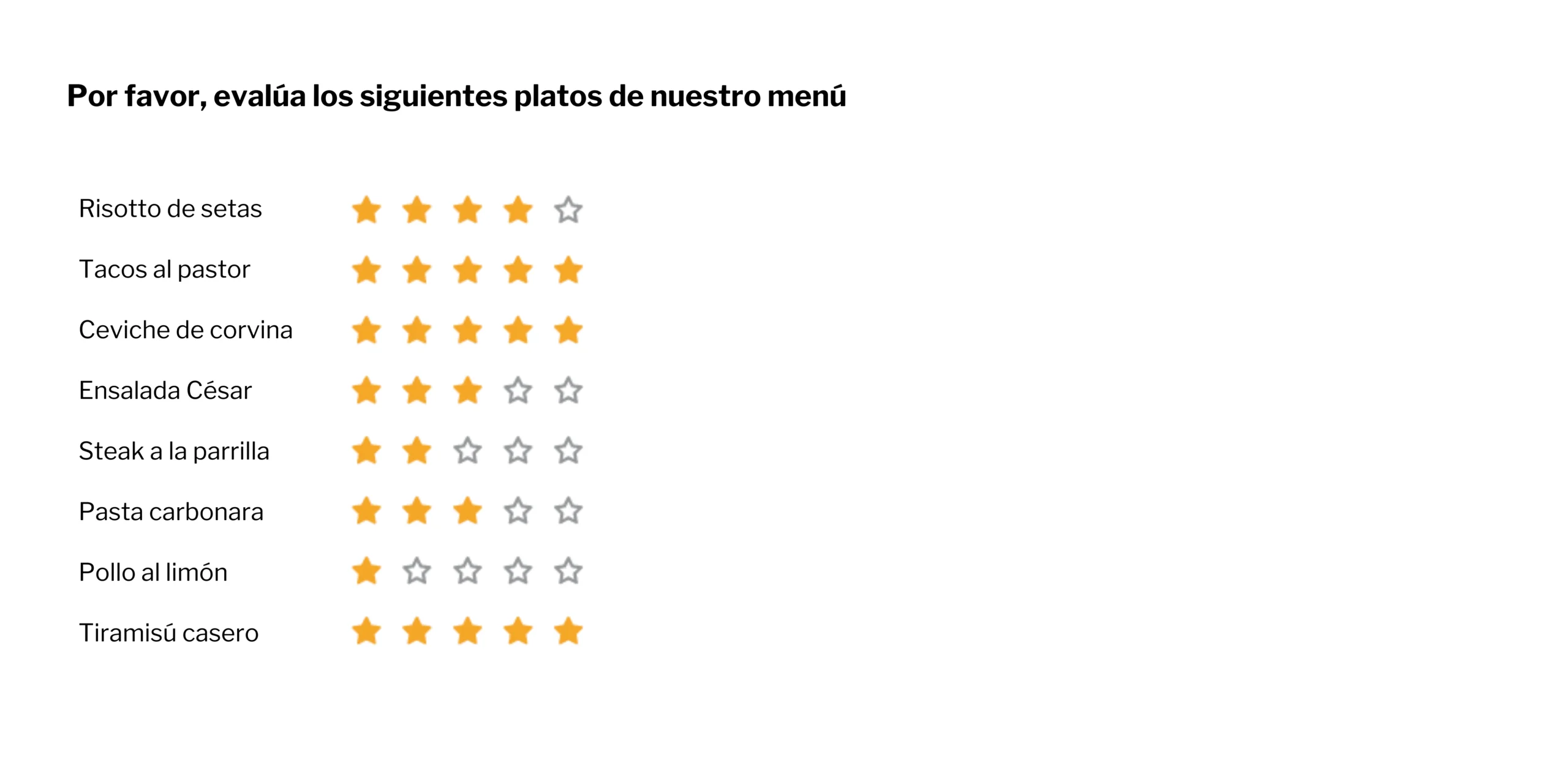Pongamos como ejemplo un restaurante gourmet que busca perfeccionar su menú ofreciendo platos que deleiten el paladar de sus clientes. Utilizando la Escala de Calificación de Estrellas, este establecimiento invita a sus comensales a evaluar cada plato que han degustado, desde entrantes hasta postres, basándose en sabor, presentación, y originalidad.