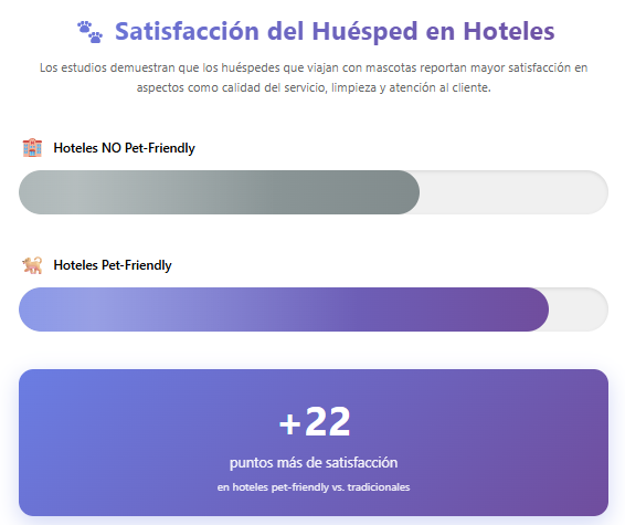 Los estudios han demostrado que los huéspedes que viajan con animales tienden a reportar una satisfacción general más alta en comparación con aquellos que no llevan mascotas. Esto incluye aspectos como la calidad del servicio, la limpieza y la atención al cliente. La diferencia puede ser de hasta +22 puntos en la escala de satisfacción de los clientes.