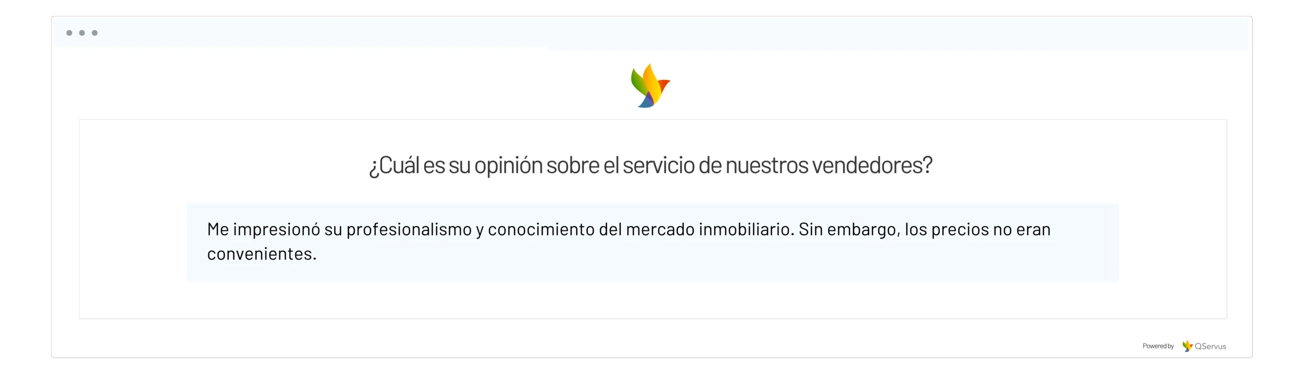 - Escenario: En una inmobiliaria, QServus se usa para recoger feedback de clientes tras interacciones clave como visitas a propiedades y reuniones de ventas.