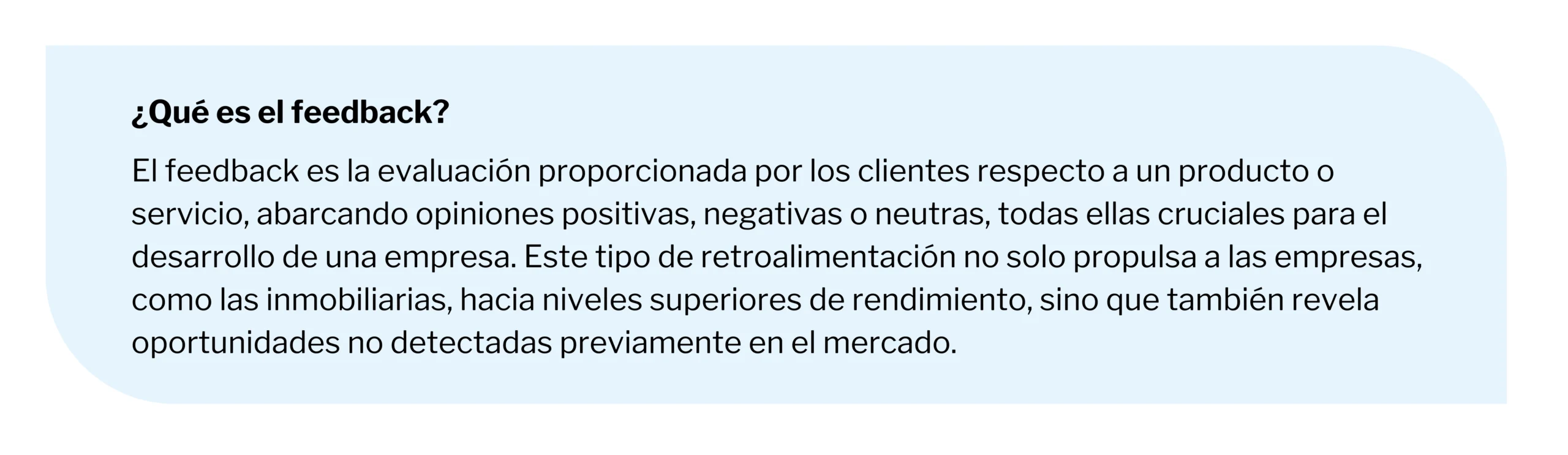 ¿Estás valorando adecuadamente el feedback en el mercado inmobiliario? Si consideras que no lo suficiente, entonces te espera un importante trabajo por delante. La retroalimentación representa un elemento crucial que toda empresa inmobiliaria que aspire a la excelencia debe integrar en su estrategia.