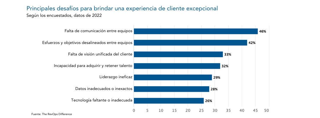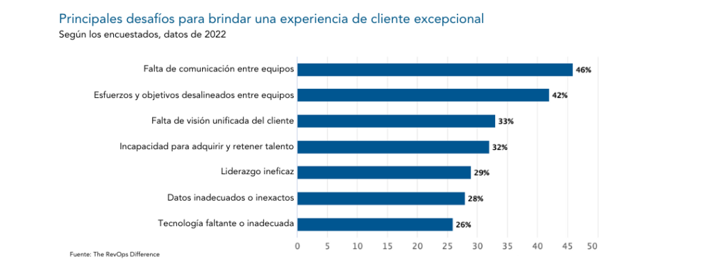 Por supuesto, las empresas B2B enfrentan una buena cantidad de desafíos para satisfacer las necesidades cambiantes de sus clientes. Por ejemplo, un informe Marketing Profs de 2022 indica que el 46 % de las empresas consideró que la falta de comunicación entre los equipos era su principal barrera para brindar una experiencia de cliente de primer nivel.