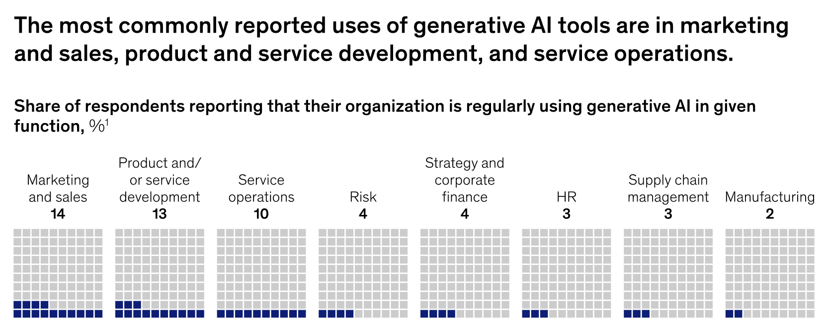 Por su parte, la encuesta de McKinsey revela que los usos más habituales de la IA generativa se concentran en las áreas de marketing y ventas, desarrollo de productos y servicios, y operaciones de servicio. Dentro de estas funciones, se destacan casos de uso específicos como la generación de contenido, la personalización de la experiencia del cliente, la identificación de tendencias y la mejora de la eficiencia operativa.