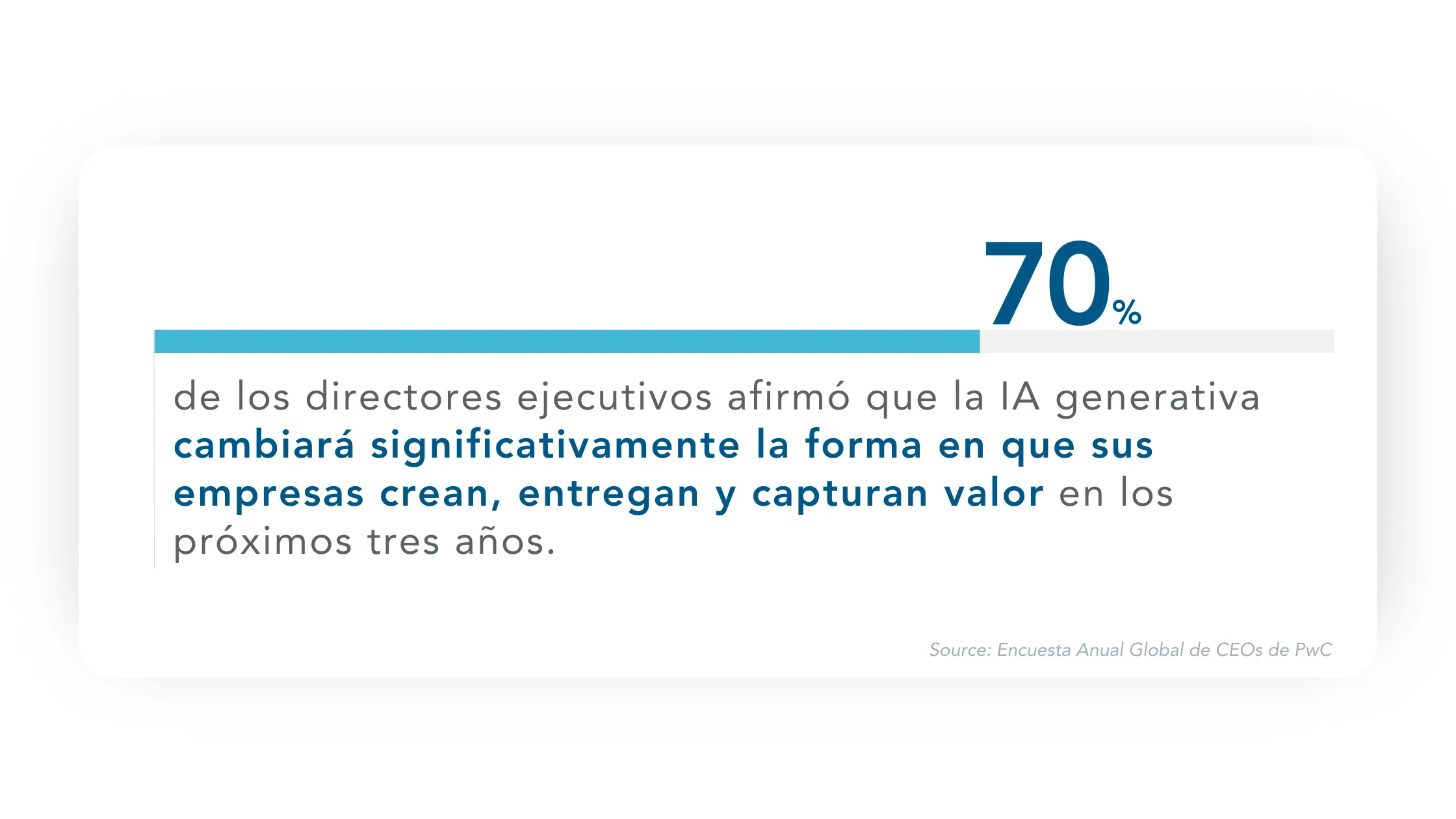 De hecho, el 70% de los directores ejecutivos afirmó que la IA generativa cambiará significativamente la forma en que sus empresas crean, entregan y capturan valor en los próximos tres años, según la 27ª Encuesta Anual Global de CEOs de PwC. Es evidente que la IA generativa está transformando la forma en que las empresas interactúan con sus clientes, brindando experiencias más personalizadas y enriquecedoras.