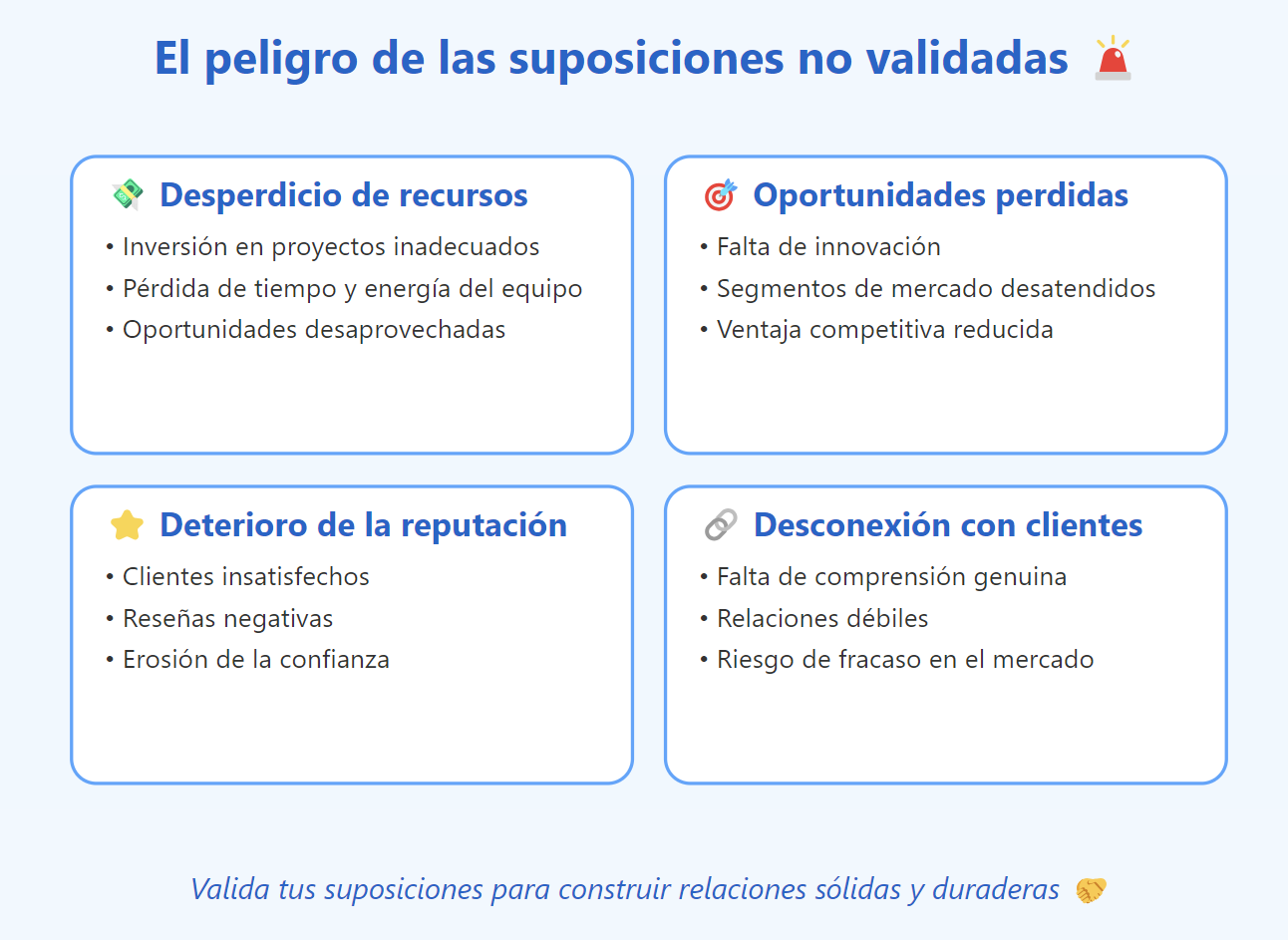 Confiar únicamente en nuestro instinto puede ser tentador, especialmente si creemos conocer bien nuestro mercado. Sin embargo, las suposiciones sin validación pueden llevarnos por caminos equivocados. Profundicemos en algunos de los riesgos que esto implica: