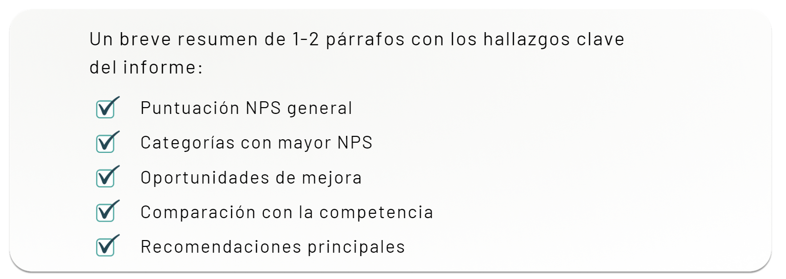 - Un breve resumen de 1-2 párrafos: En estos párrafos, debes destacar los hallazgos clave del informe, como la puntuación NPS general, las categorías con mayor NPS, las oportunidades de mejora, la comparación con la competencia y las recomendaciones principales.