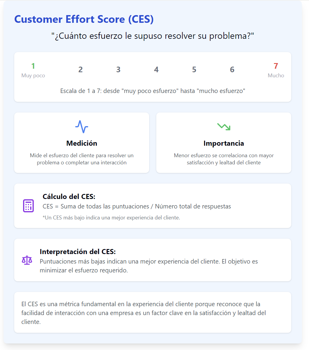 Esta pregunta mide el esfuerzo que requiere el cliente para lograr su objetivo. Es un excelente predictor de la lealtad del cliente, ya que la facilidad de uso impacta directamente en la satisfacción.