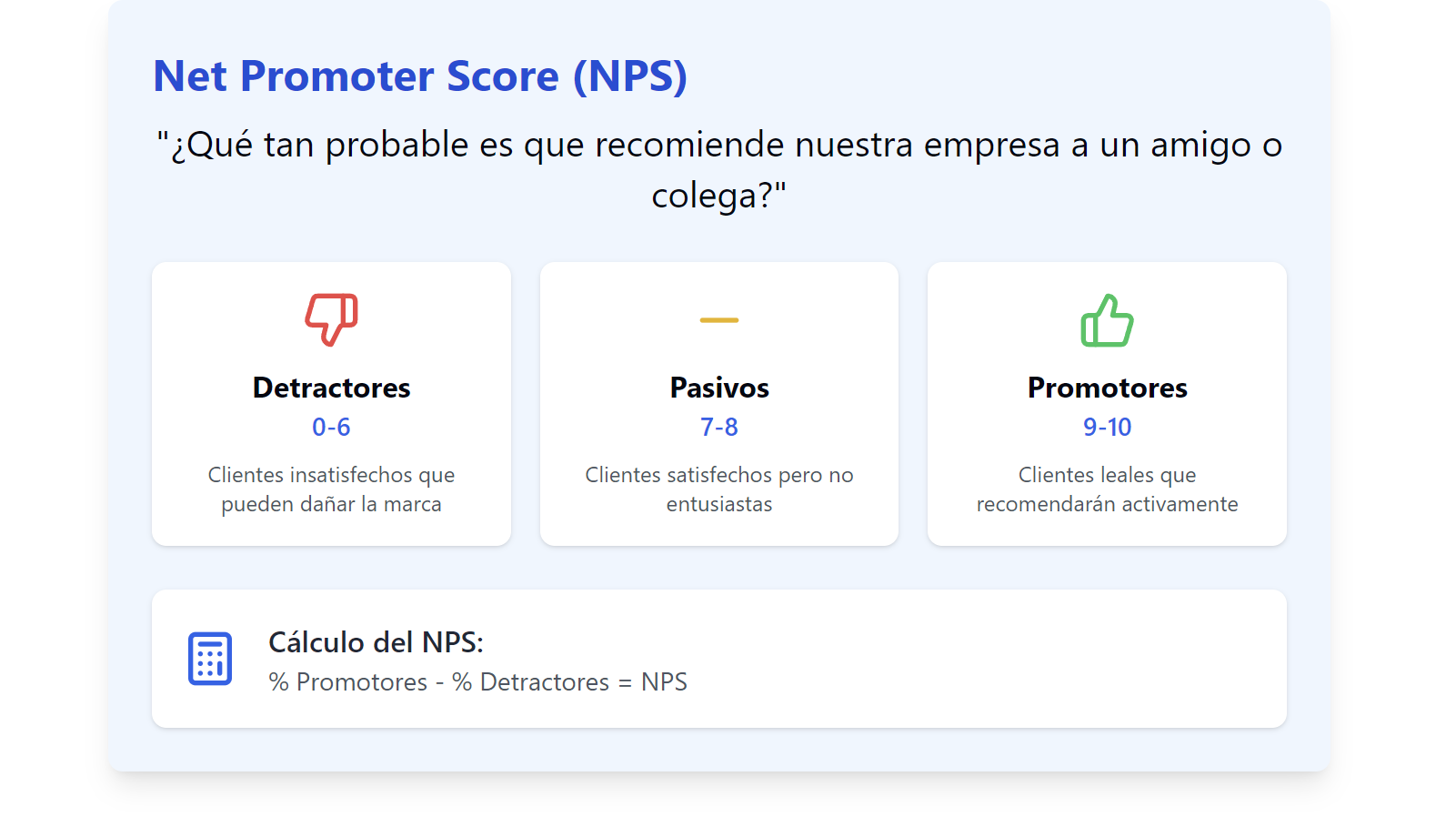 Esta pregunta es crucial porque mide la lealtad del cliente y su disposición a ser embajador de tu marca. Se evalúa en una escala de 0 a 10, donde las respuestas te permiten identificar promotores, pasivos y detractores.
