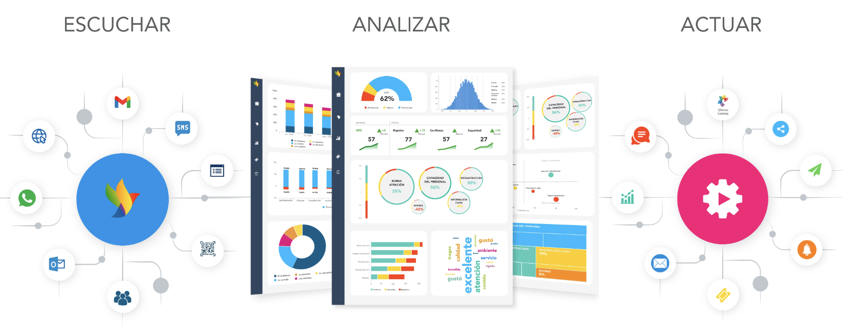 Junto con la recolección, está el análisis de esa información. Procesar los datos y comprender las medidas que debemos activar puede ser desafiante. Para eso, contamos con la Inteligencia Artificial de QServus. Nuestro software cuenta con tecnologías te permite obtener respuestas en tiempo real y mantenerte un paso adelante.