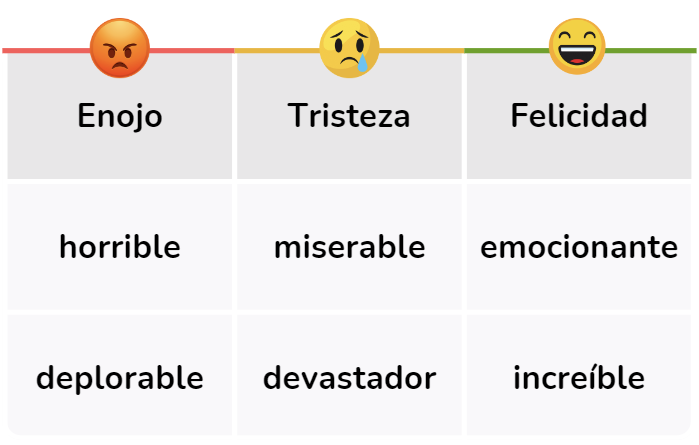 Palabras como «horrible» y «deplorable» pueden sugerir enojo, mientras que «miserable» y «devastador» pueden indicar tristeza. Por otro lado, términos como «emocionante» o «increíble» pueden denotar felicidad.