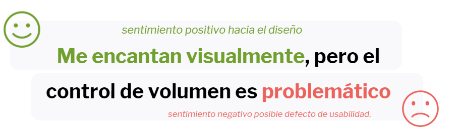 Frases como «Me encantan visualmente,» indicarían un sentimiento positivo hacia el diseño, mientras que «pero el control de volumen es problemático» alertaría sobre un posible defecto de usabilidad.